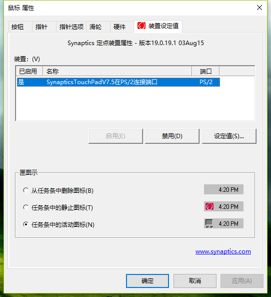 最近用Word用的比较多,所以总是被Synaptics触摸板的默认设置影响到,可是打开Synaptics设置的时候,没有前两年都有的“连接外部USB指向装置时禁用内部指向装置”