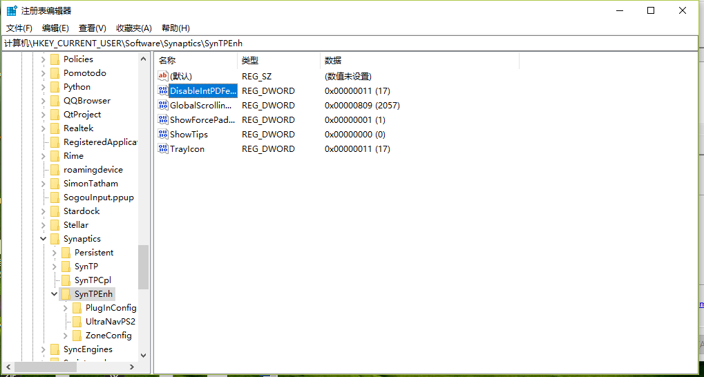 将DisableIntPDFeature选项的数值数据(默认11)改为33,因为INT 33H是DOS中的鼠标中断,Synaptics驱动出于历史原因沿用了这个定义。