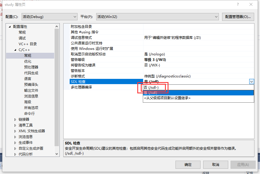 在属性配置–》C/C++–》常规 在右边窗口里面的“SDL检查”设置为否就可以了