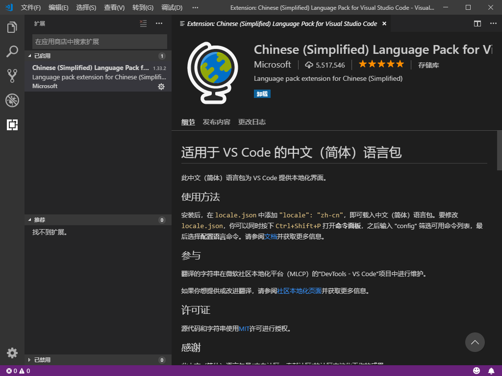 如果重启后vscode菜单等仍然是英文显示,在商店查看已安装的插件,把中文插件重新安装一遍(如下图),然后在重启工具。
